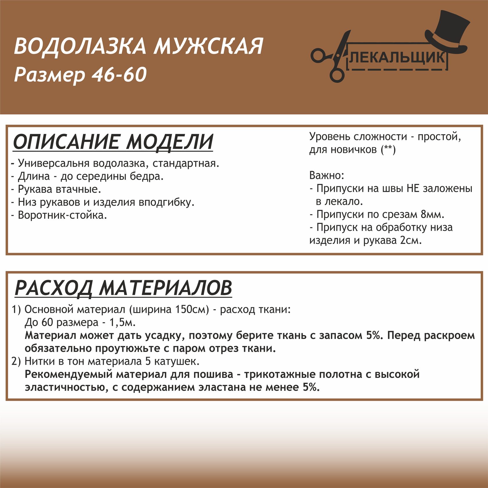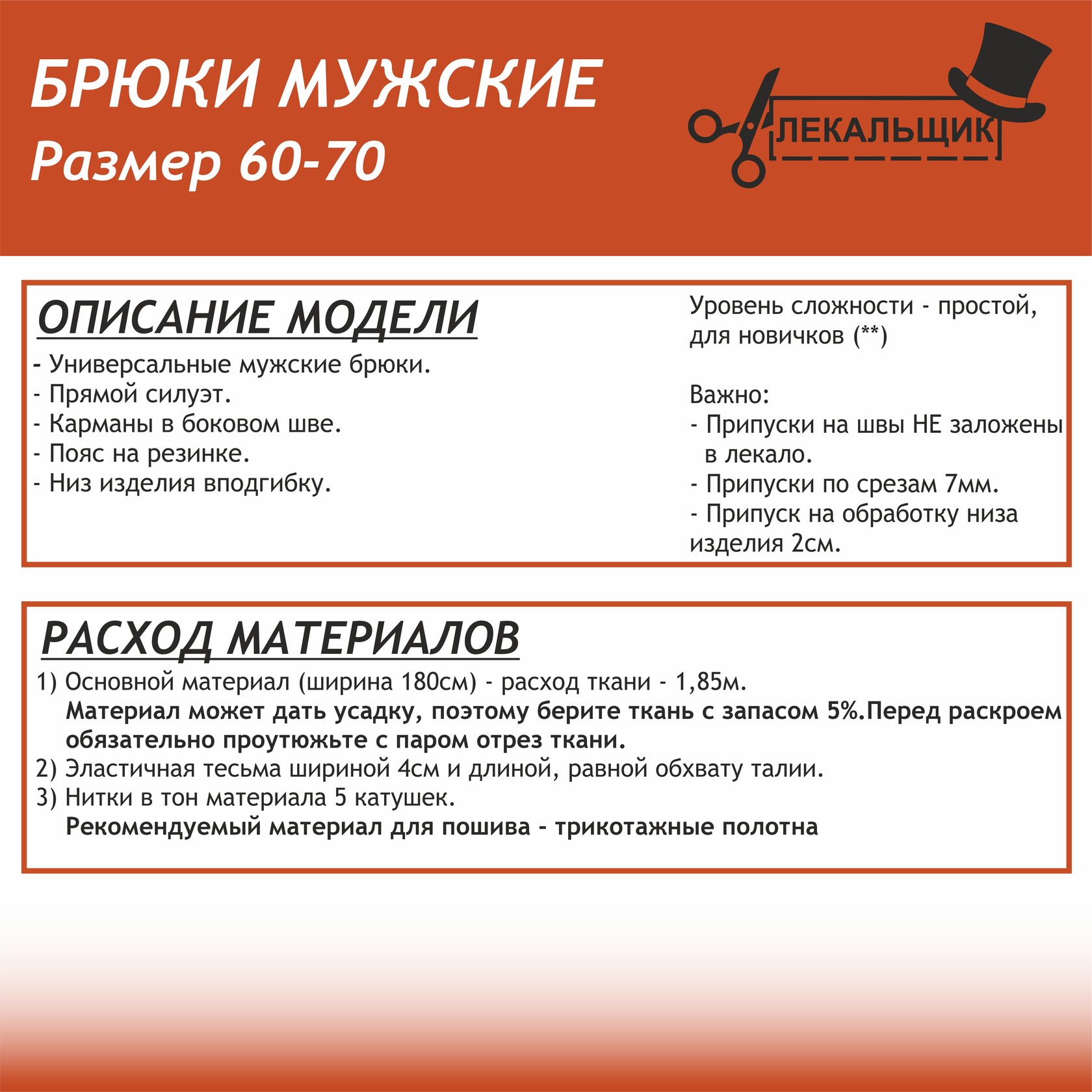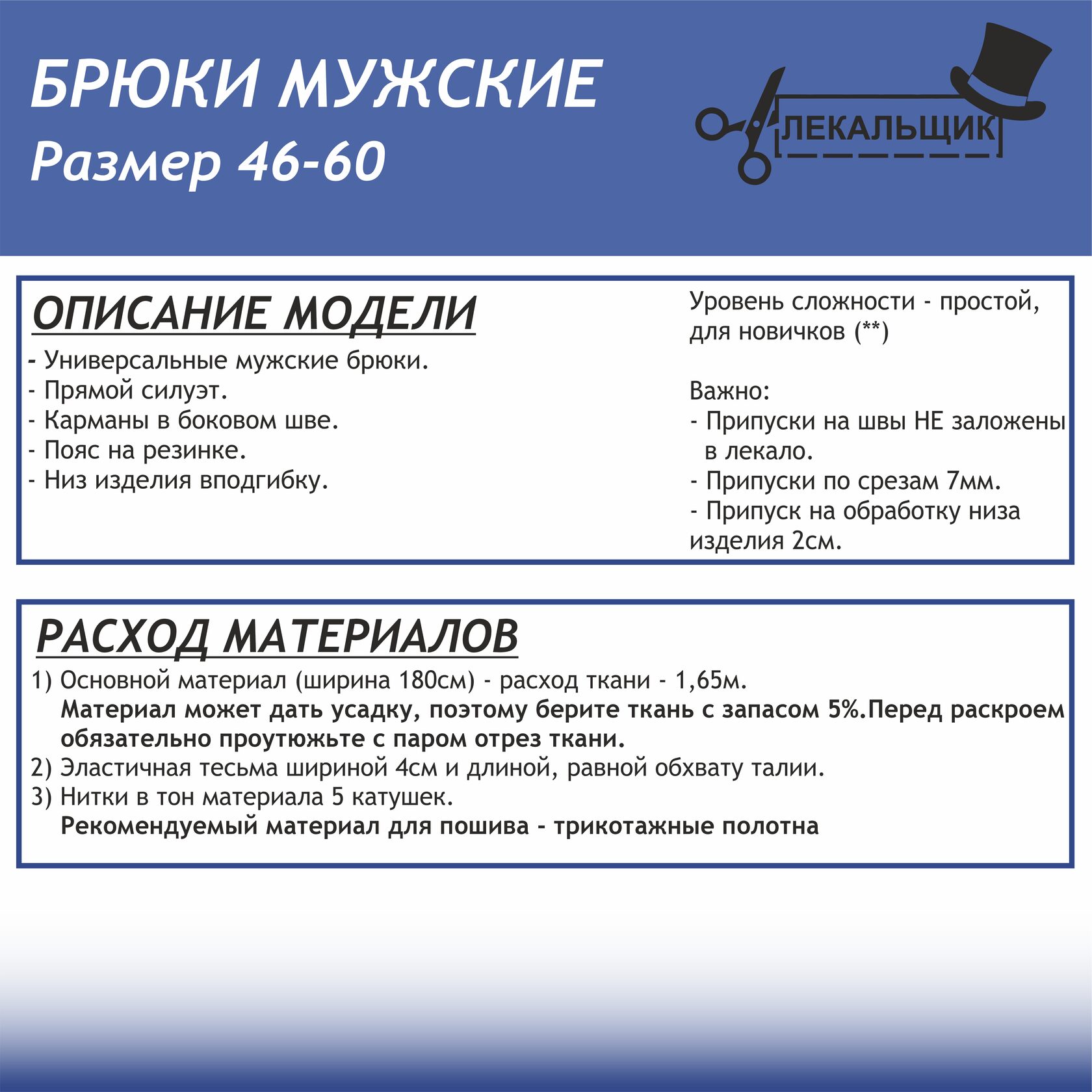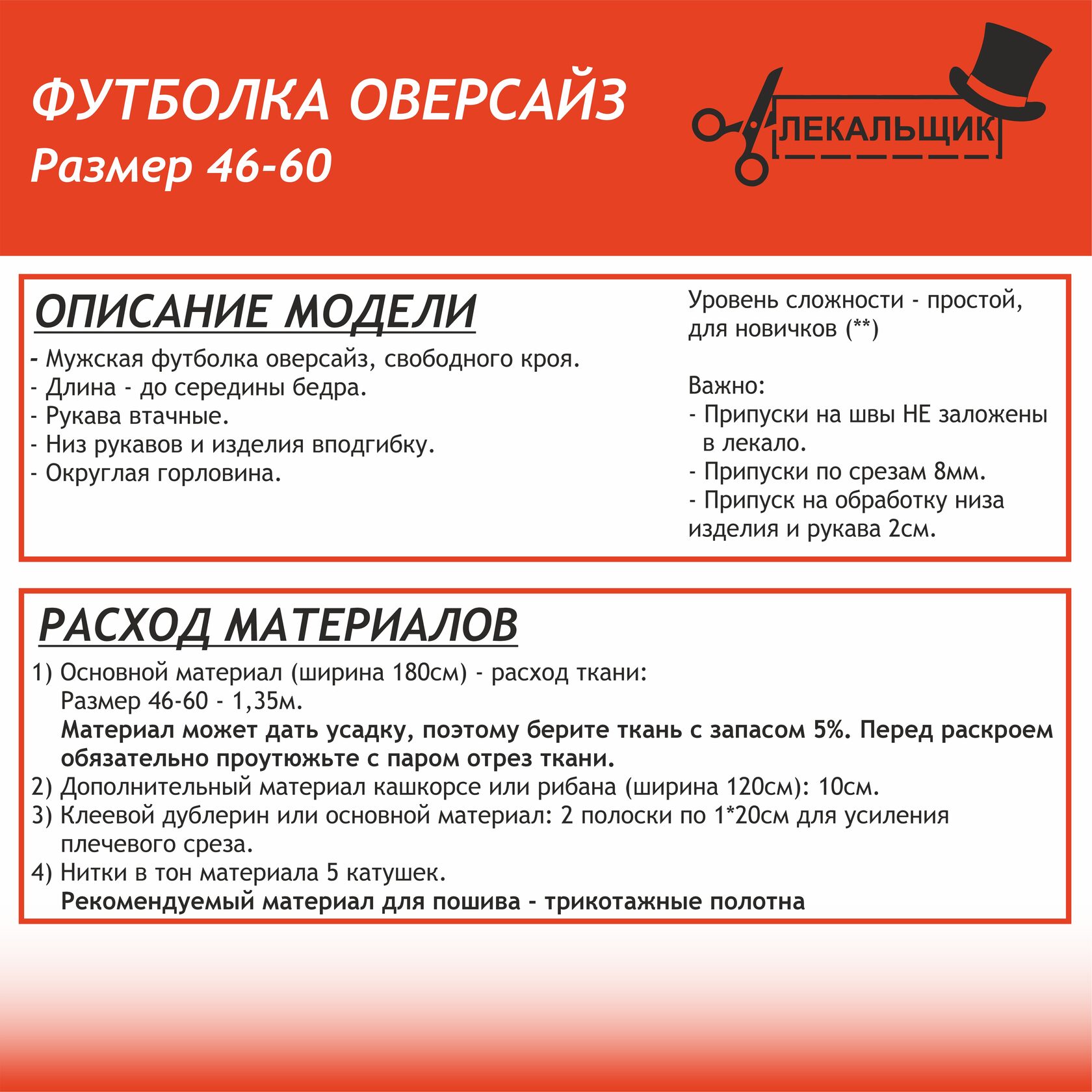 ВАЖНО: В комплекте выкроек 46-60 припуски на швы не заложены.