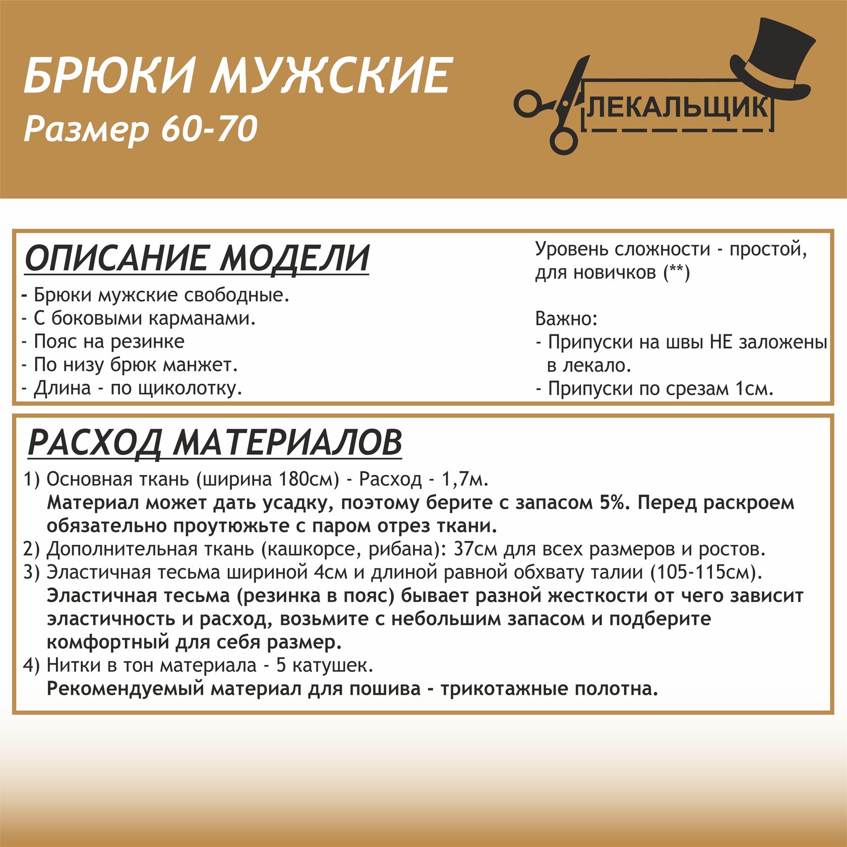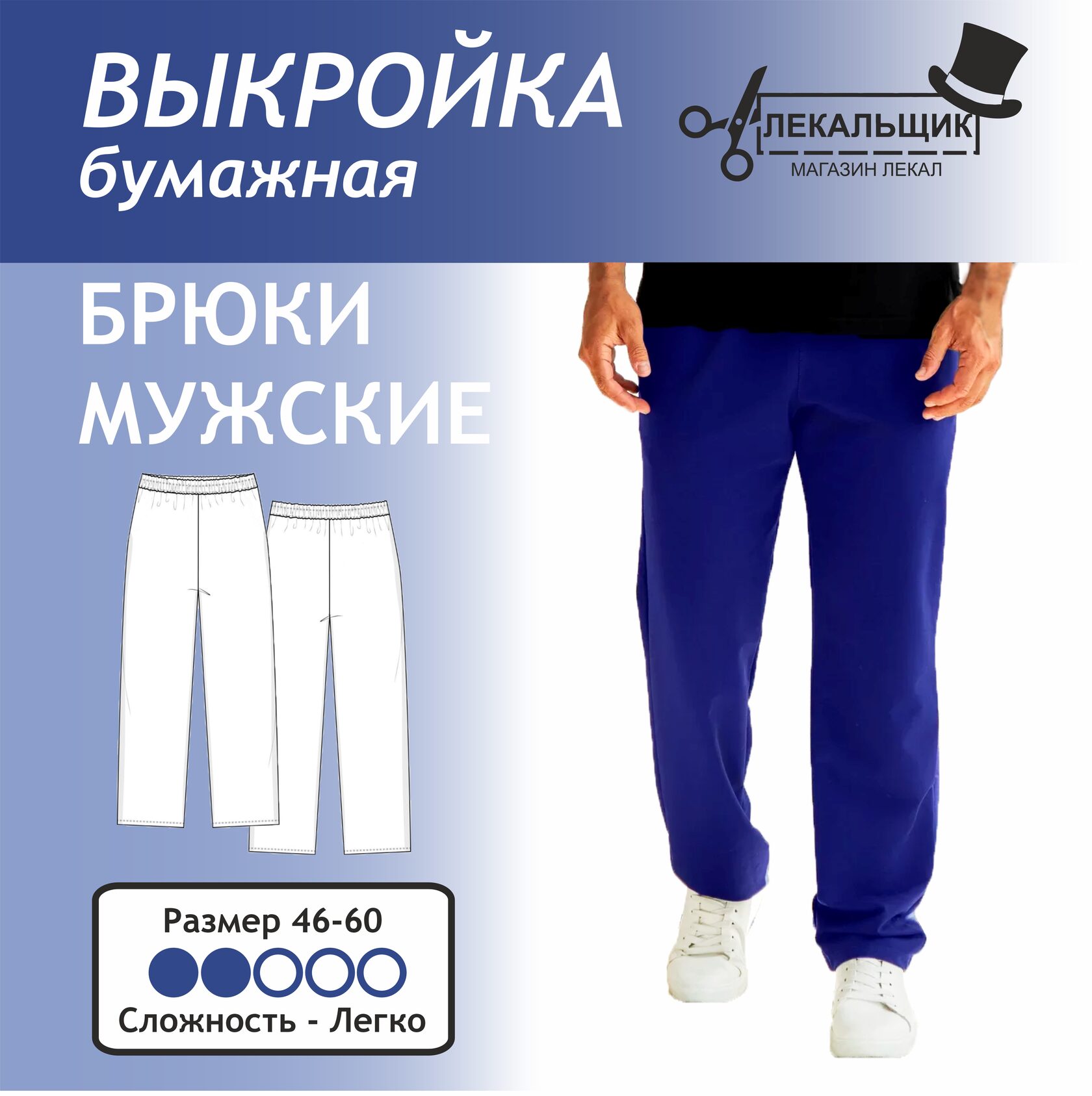 Эта выкройка — отличный выбор для активных мужчин, ценящих удобство и практичность. Благодаря свободному крою и двойной резинке (на поясе и внизу), сшить такие брюки сможет даже новичок. Они станут базовой вещью для спорта, прогулок или просто для повседневной носки. Вы получите бумажную выкройку в натуральную величину, готовую к раскладке на ткани. Все детали подписаны, инструкция по пошиву прилагается.