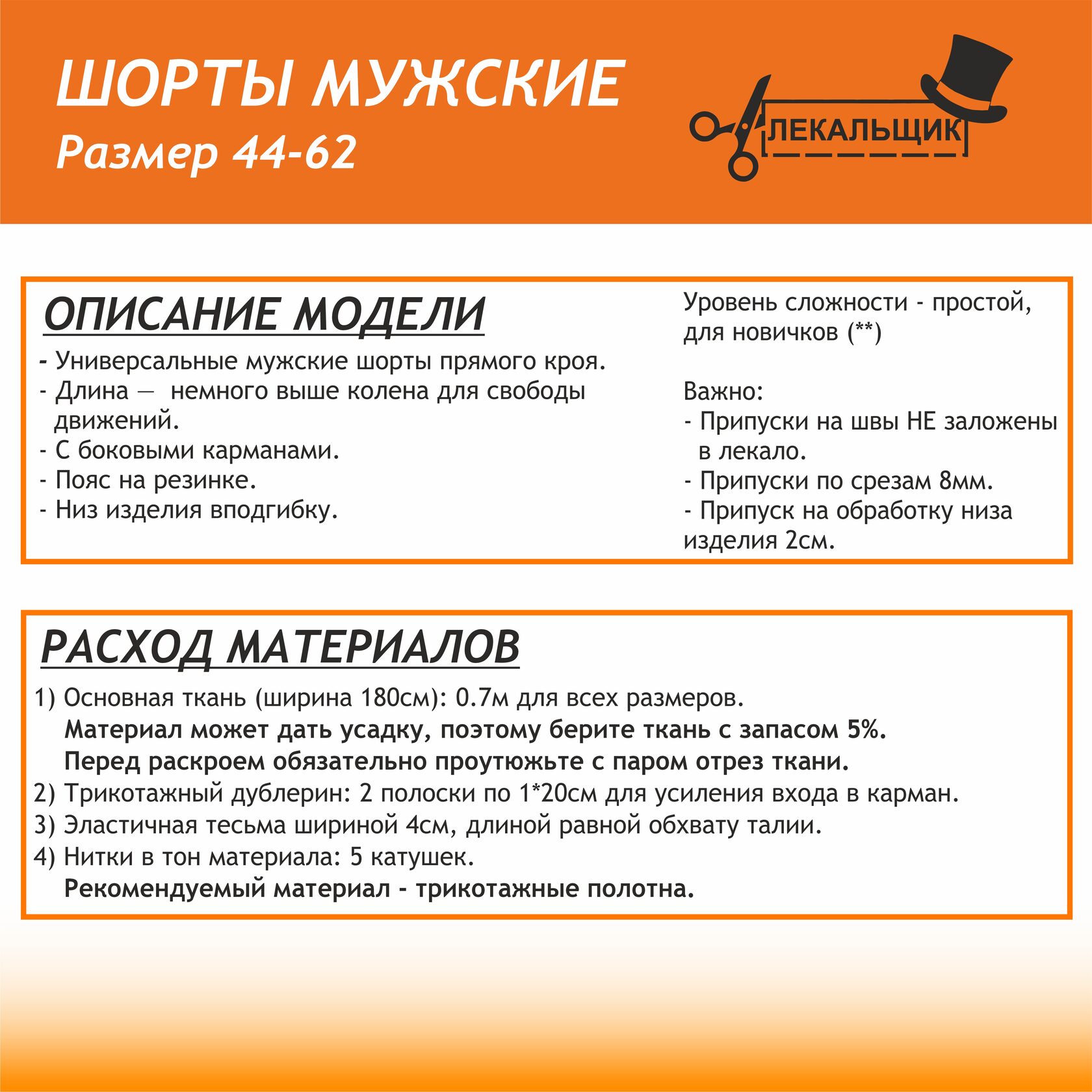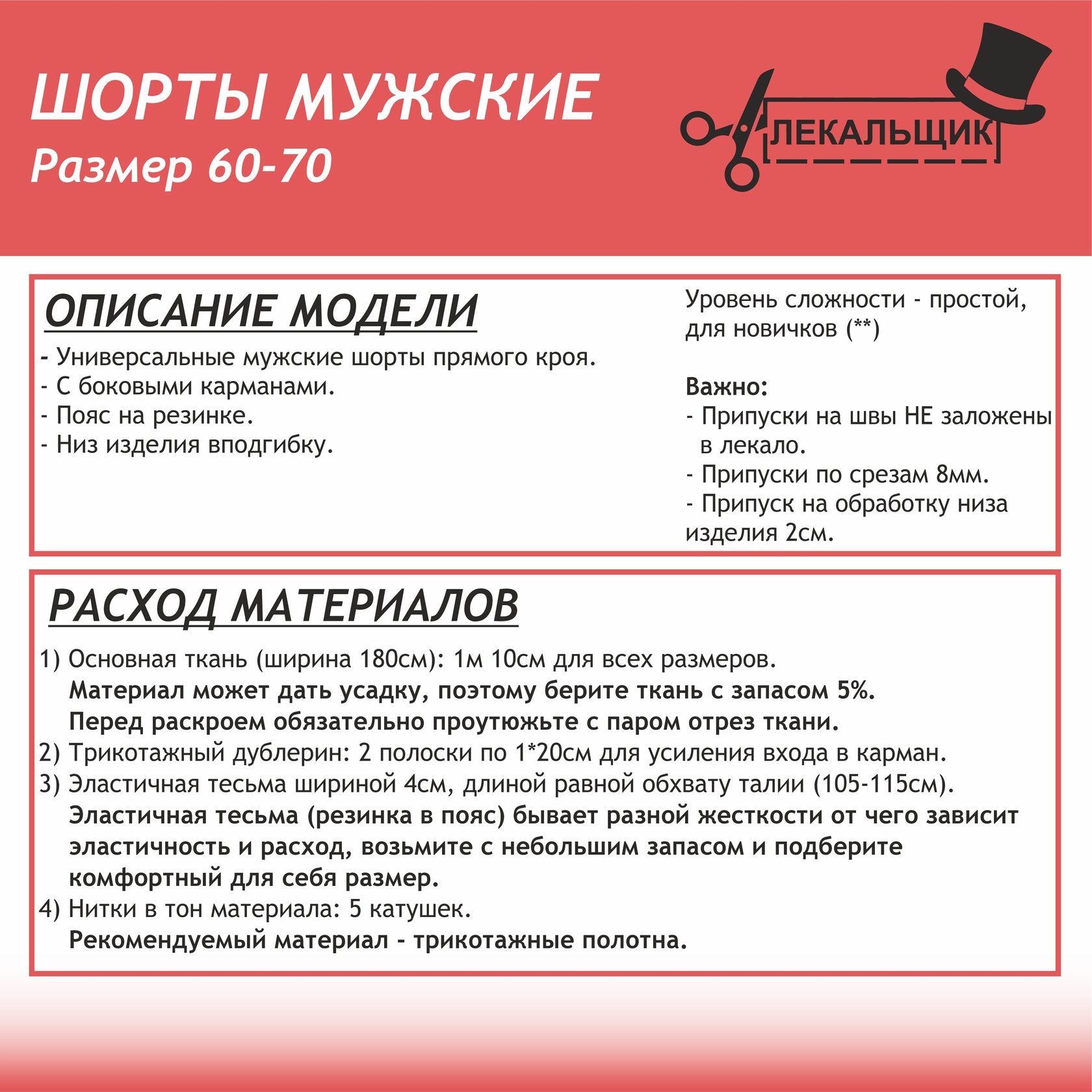 Подарите себе комфорт дома и в жаркие дни! Эта готовая выкройка в натуральную величину позволит вам без труда сшить удобные и практичные мужские шорты классической длины.