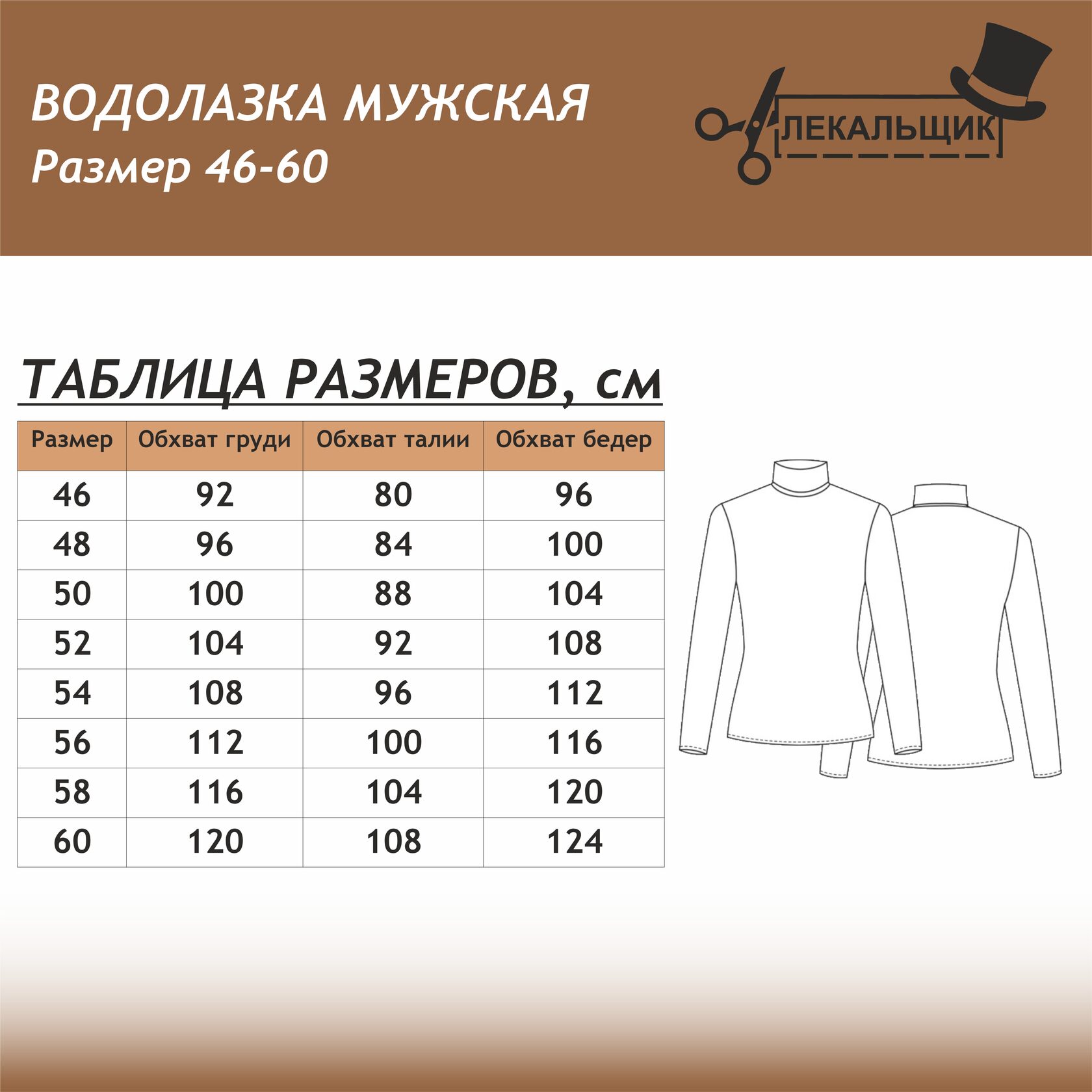 Эта выкройка в натуральную величину предназначена для размеров 46-60, рост 164-182 и позволит вам сшить водолазку из трикотажной ткани. Она имеет универсальный крой с длиной до середины бедра, втачными рукавами и воротник-стойку. Низ рукавов и изделия обработан вподгибку, что придает изделию аккуратный вид.