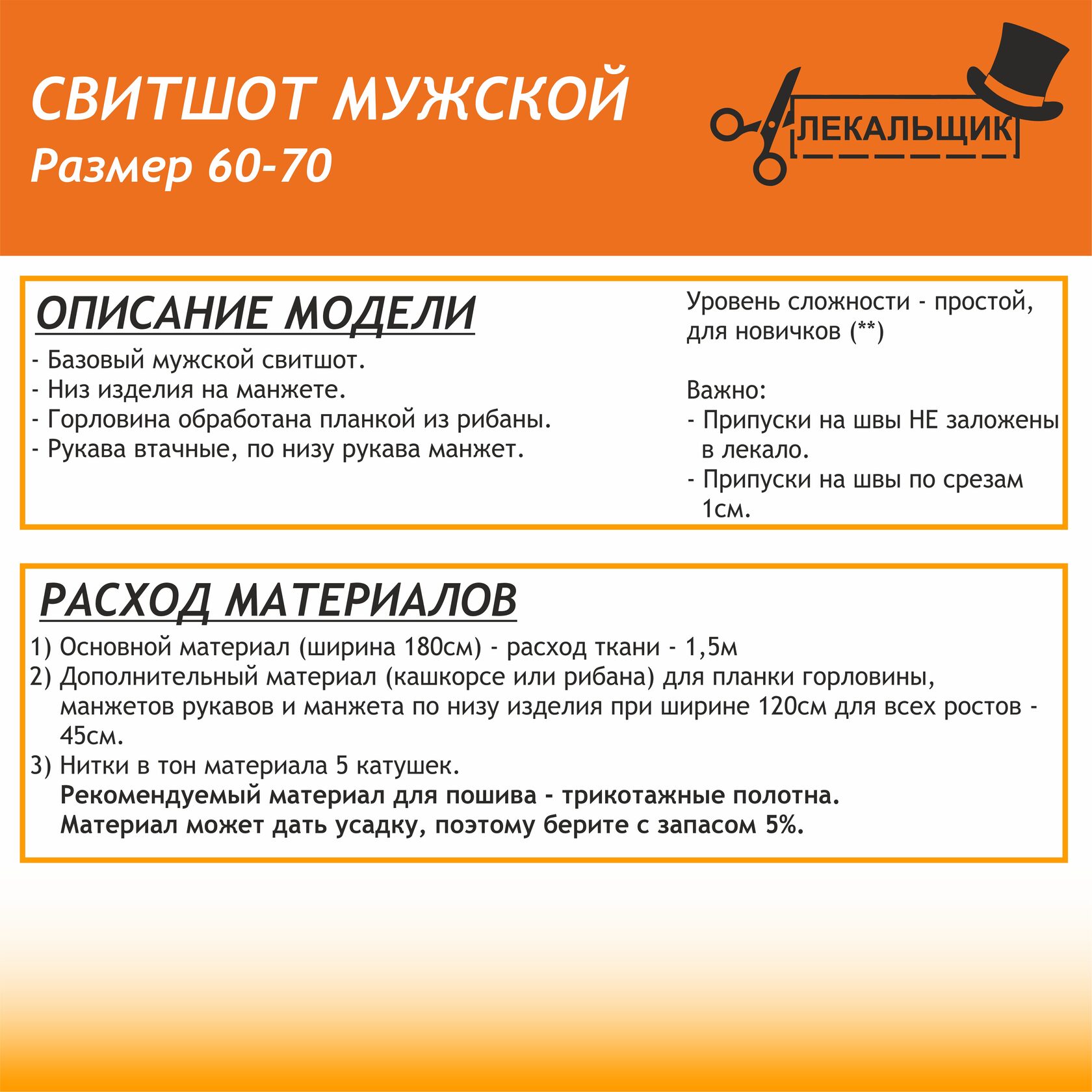 ВАЖНО: В комплекте выкроек 60-70 припуски на швы не заложены.