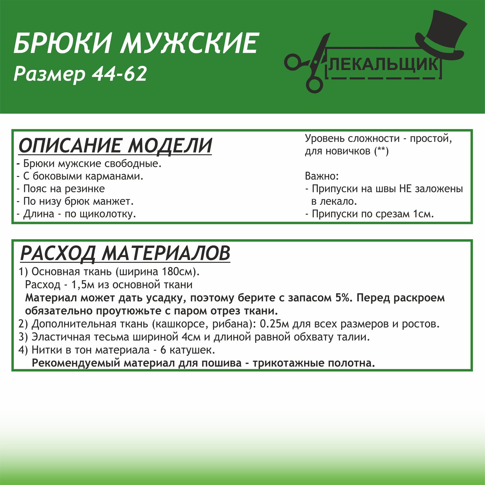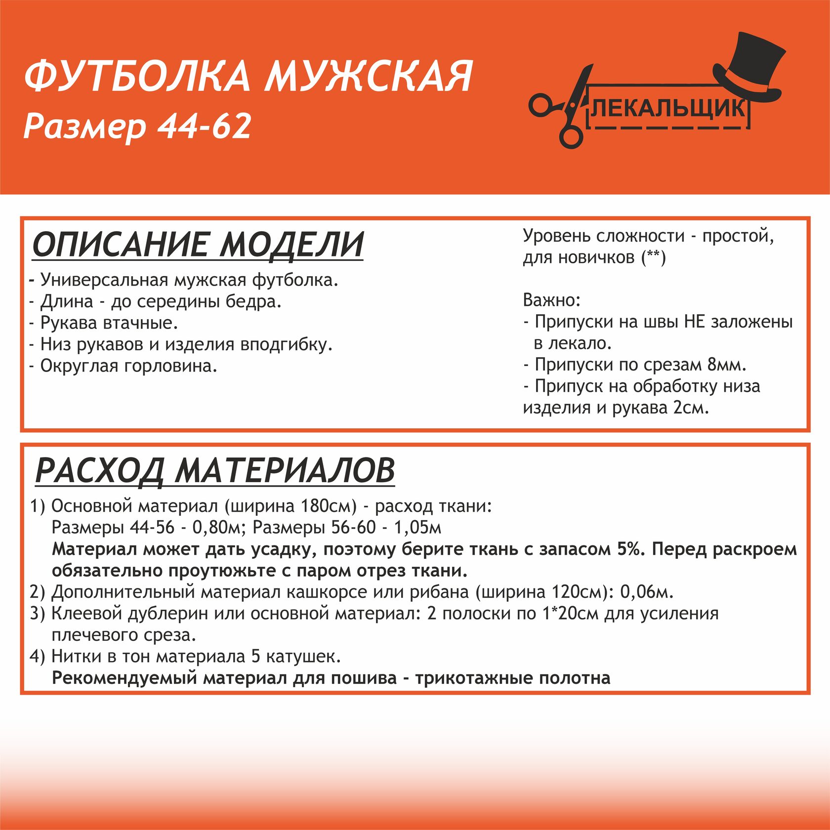 ВАЖНО: В комплекте выкроек 44-62 припуски на швы не заложены.