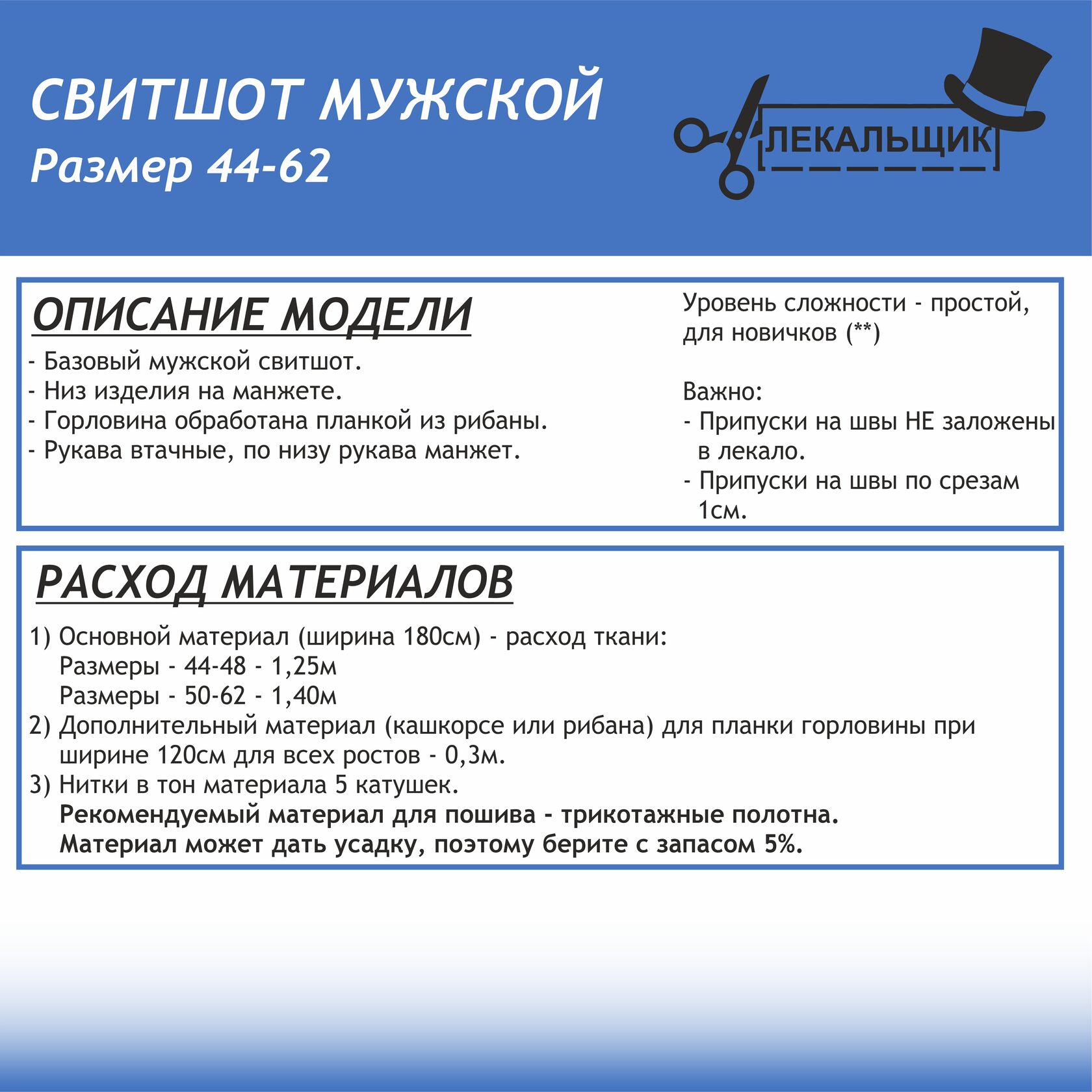 ВАЖНО: в комплекте размеров 44-62 припуски на швы не заложены